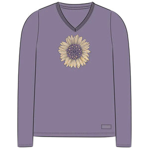 Life is Good. Women's Detailed Sunflower Long Sleeve Crusher Vee, Dusk Purple