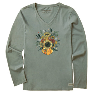 Life is Good. Women's Fall Pumpkin Flowers Long Sleeve Crusher Vee, Moss Green