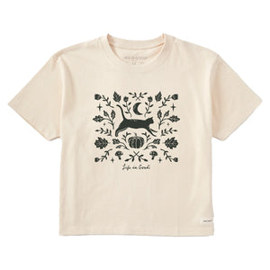 Life is Good. Women's Fall Foliage Cat Short Sleeve Crusher Boxy Tee, Putty White