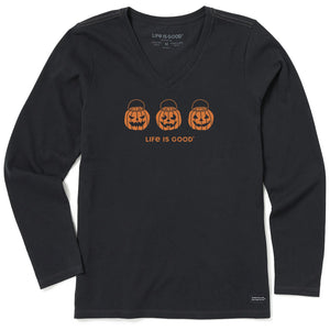 Life is Good. Women's Jack O Lantern Trio Long Sleeve Crusher Vee, Faded Black