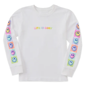 Life is Good. Kids Checkered Smiles Long Sleeve Crusher Tee, Cloud White