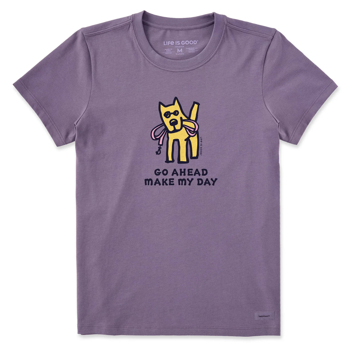 {"id":8629273624747,"title":"Life is Good Women's Go Ahead Make My Day Short Sleeve Crusher Tee, Dusk Purple","handle":"life-is-good-womens-go-ahead-make-my-day-short-sleeve-crusher-tee-dusk-purple","description":"\u003cp\u003eInstant classics don't just happen. We've spent over 20 years perfecting our original Crusher Tee, and its laid-back style has the staying power to prove it. Washed for everyday softness, this classic fit customer favorite barely skims the body for a look that's as easygoing as you are.\u003c\/p\u003e\n\u003cul\u003e\n\u003cli\u003e5.9 oz.\u003c\/li\u003e\n\u003cli\u003eGarment washed for softness.\u003c\/li\u003e\n\u003cli\u003eCotton\/Spandex rib at neck and cuff, and self-fabric taping from shoulder to shoulder.\u003c\/li\u003e\n\u003cli\u003ePrinted graphic.\u003c\/li\u003e\n\u003cli\u003eDo what you love. Love what you do. locker patch.\u003c\/li\u003e\n\u003cli\u003eImported\u003c\/li\u003e\n\u003c\/ul\u003e","published_at":"2026-01-14T13:03:34-05:00","created_at":"2026-01-09T11:20:02-05:00","vendor":"Life is Good","type":"Women's Crusher","tags":["new arrivals","stpatricks2025","w crusher","w crusher ls","w lig","W LIG CRUSHER","w ligtop","winter2025"],"price":2950,"price_min":2950,"price_max":2950,"available":true,"price_varies":false,"compare_at_price":null,"compare_at_price_min":0,"compare_at_price_max":0,"compare_at_price_varies":false,"variants":[{"id":46032697983147,"title":"Extra Small","option1":"Extra Small","option2":null,"option3":null,"sku":"198899569804","requires_shipping":true,"taxable":true,"featured_image":null,"available":true,"name":"Life is Good Women's Go Ahead Make My Day Short Sleeve Crusher Tee, Dusk Purple - Extra Small","public_title":"Extra Small","options":["Extra Small"],"price":2950,"weight":0,"compare_at_price":null,"inventory_quantity":1,"inventory_management":"shopify","inventory_policy":"deny","barcode":null,"requires_selling_plan":false,"selling_plan_allocations":[]},{"id":46032698015915,"title":"Small","option1":"Small","option2":null,"option3":null,"sku":"198899569811","requires_shipping":true,"taxable":true,"featured_image":null,"available":true,"name":"Life is Good Women's Go Ahead Make My Day Short Sleeve Crusher Tee, Dusk Purple - Small","public_title":"Small","options":["Small"],"price":2950,"weight":0,"compare_at_price":null,"inventory_quantity":2,"inventory_management":"shopify","inventory_policy":"deny","barcode":null,"requires_selling_plan":false,"selling_plan_allocations":[]},{"id":46032698048683,"title":"Medium","option1":"Medium","option2":null,"option3":null,"sku":"198899569828","requires_shipping":true,"taxable":true,"featured_image":null,"available":true,"name":"Life is Good Women's Go Ahead Make My Day Short Sleeve Crusher Tee, Dusk Purple - Medium","public_title":"Medium","options":["Medium"],"price":2950,"weight":0,"compare_at_price":null,"inventory_quantity":3,"inventory_management":"shopify","inventory_policy":"deny","barcode":null,"requires_selling_plan":false,"selling_plan_allocations":[]},{"id":46032698081451,"title":"Large","option1":"Large","option2":null,"option3":null,"sku":"198899569835","requires_shipping":true,"taxable":true,"featured_image":null,"available":true,"name":"Life is Good Women's Go Ahead Make My Day Short Sleeve Crusher Tee, Dusk Purple - Large","public_title":"Large","options":["Large"],"price":2950,"weight":0,"compare_at_price":null,"inventory_quantity":4,"inventory_management":"shopify","inventory_policy":"deny","barcode":null,"requires_selling_plan":false,"selling_plan_allocations":[]},{"id":46032698114219,"title":"X-Large","option1":"X-Large","option2":null,"option3":null,"sku":"198899569842","requires_shipping":true,"taxable":true,"featured_image":null,"available":true,"name":"Life is Good Women's Go Ahead Make My Day Short Sleeve Crusher Tee, Dusk Purple - X-Large","public_title":"X-Large","options":["X-Large"],"price":2950,"weight":0,"compare_at_price":null,"inventory_quantity":4,"inventory_management":"shopify","inventory_policy":"deny","barcode":null,"requires_selling_plan":false,"selling_plan_allocations":[]},{"id":46032698146987,"title":"XX-Large","option1":"XX-Large","option2":null,"option3":null,"sku":"198899569859","requires_shipping":true,"taxable":true,"featured_image":null,"available":true,"name":"Life is Good Women's Go Ahead Make My Day Short Sleeve Crusher Tee, Dusk Purple - XX-Large","public_title":"XX-Large","options":["XX-Large"],"price":2950,"weight":0,"compare_at_price":null,"inventory_quantity":3,"inventory_management":"shopify","inventory_policy":"deny","barcode":null,"requires_selling_plan":false,"selling_plan_allocations":[]},{"id":46032698179755,"title":"XXX-Large","option1":"XXX-Large","option2":null,"option3":null,"sku":"198899569866","requires_shipping":true,"taxable":true,"featured_image":null,"available":true,"name":"Life is Good Women's Go Ahead Make My Day Short Sleeve Crusher Tee, Dusk Purple - XXX-Large","public_title":"XXX-Large","options":["XXX-Large"],"price":2950,"weight":0,"compare_at_price":null,"inventory_quantity":1,"inventory_management":"shopify","inventory_policy":"deny","barcode":null,"requires_selling_plan":false,"selling_plan_allocations":[]}],"images":["\/\/jakesgoodnewport.com\/cdn\/shop\/files\/160600-1.webp?v=1767975814","\/\/jakesgoodnewport.com\/cdn\/shop\/files\/160600-2.webp?v=1767975814"],"featured_image":"\/\/jakesgoodnewport.com\/cdn\/shop\/files\/160600-1.webp?v=1767975814","options":["Size"],"media":[{"alt":null,"id":32431042494635,"position":1,"preview_image":{"aspect_ratio":1.0,"height":1536,"width":1536,"src":"\/\/jakesgoodnewport.com\/cdn\/shop\/files\/160600-1.webp?v=1767975814"},"aspect_ratio":1.0,"height":1536,"media_type":"image","src":"\/\/jakesgoodnewport.com\/cdn\/shop\/files\/160600-1.webp?v=1767975814","width":1536},{"alt":null,"id":32431042461867,"position":2,"preview_image":{"aspect_ratio":1.0,"height":1536,"width":1536,"src":"\/\/jakesgoodnewport.com\/cdn\/shop\/files\/160600-2.webp?v=1767975814"},