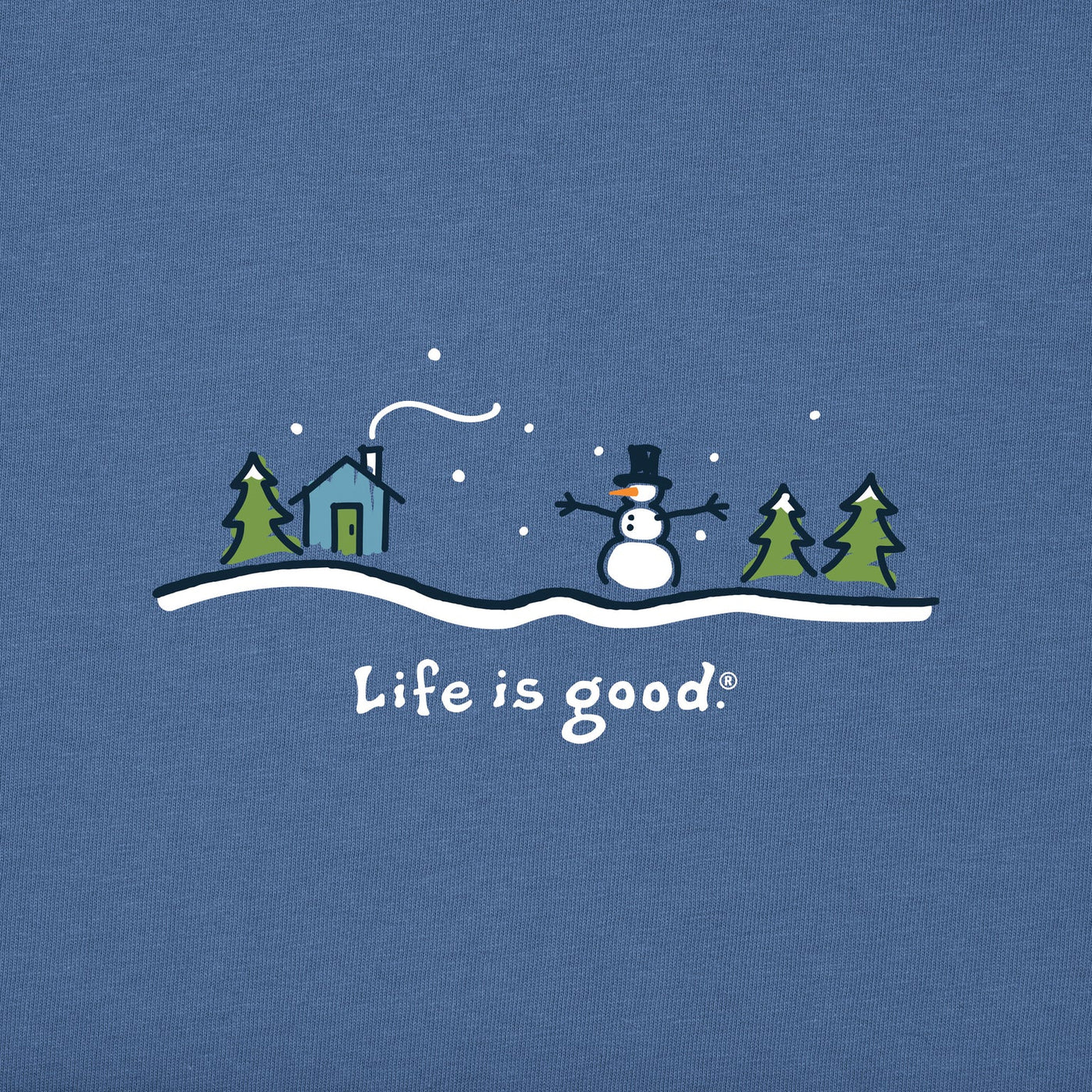Life is Good. Women's Snowman Cabin Landscape Long Sleeve Crusher Vee, Vintage Blue